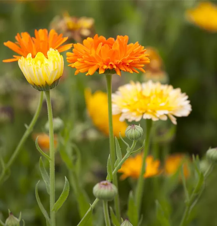 Zum Verzehr geeignet. Je nach Sorte, bildet Calendula officinalis körbchenartige Blüten in verschiedenen Farben. Diese sind angenehm duftend.