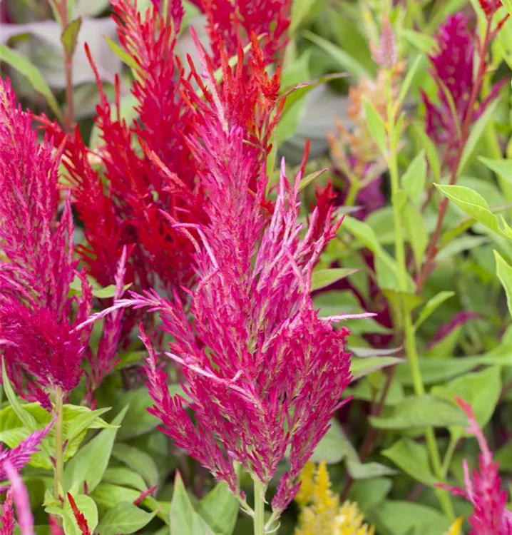 Die Federbusch-Celosie (Celosia argentea var. plumosa) ist eine beliebte Pflanze für den Balkon. Die unzähligen Blüten erscheinen, je nach Sorte, in verschiedenen Farben die ganze Saison hindurch. Ein sonniger Standort und ein durchlässiges Substrat werden bevorzugt.