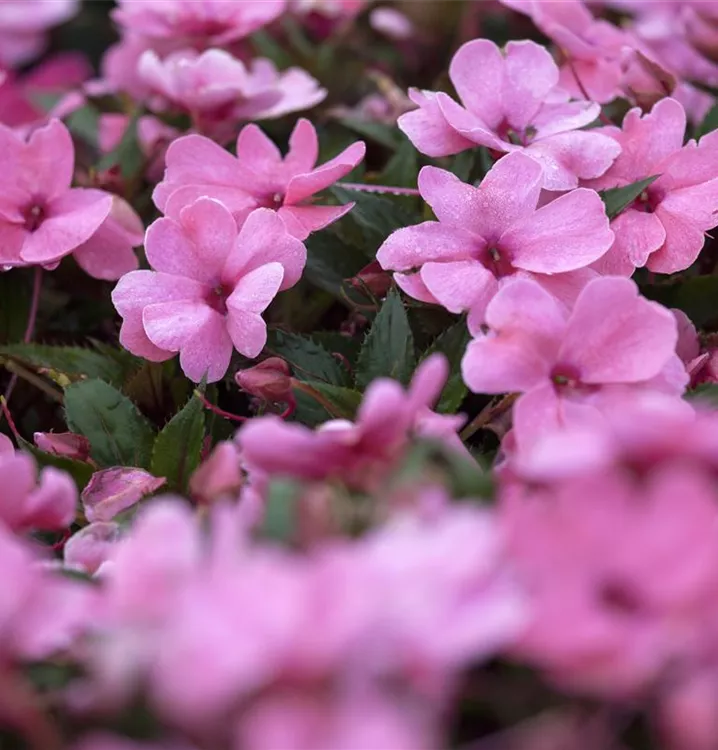 Das Sonnenlieschen (Impatiens neuguinea) ist eine beliebte Pflanze für den Balkon, die während der gesamten Saison unzählige rosafarbene Blüten bildet. Die dunkelgrünen Blätter sind eiförmig. Ein sonniger bis schattiger Standort und ein durchlässiges Substrat werden bevorzugt.