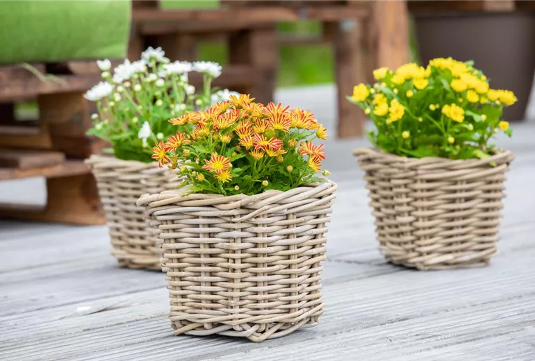 Vor dem Chrysanthemen pflanzen kommt es auf die richtigen Grundlagen an. Ist der Boden locker, nährstoffreich und durchlässig, kann im Spätsommer gepflanzt werden. Zusätzlicher Dünger ist nicht notwendig, denn oft reicht gerade bei frischer Blumenerde der vorhandene Düngevorrat vollkommen aus. Solange der Boden nicht gefroren ist, können winterharte Chrysanthemen auch ins Beet gepflanzt werden. Dabei sollte man aber das Chrysanthemen pflanzen so früh wie möglich durchführen, damit die Pflanzen noch gut einwurzeln können und den Winter unbeschadet überstehen. Im Frühjahr ist es dann Zeit für einen Rückschnitt, damit die Pflanzen auch im neuen Gartenjahr wieder kräftig und üppig blühen. Im März, wenn sich die ersten neuen Triebe zeigen, ist der perfekte Zeitpunkt dafür. Dabei schneidet man die verwelkten Pflanzenteile bodennah mit einer scharfen Schere ab, ohne dabei die jungen frischen Triebe ebenfalls zu entfernen. Und grundsätzlich lässt sich nach dem Chrysanthemen pflanzen sagen: Im zweiten Jahr geht’s richtig los! Denn ab dem zweiten Standjahr zeigen die Pflanzen ihre ganze Pracht und blühen üppiger und prächtiger, als zuvor.