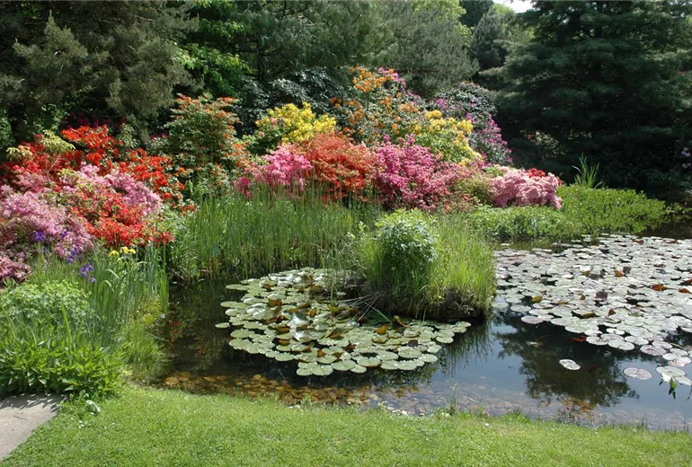 Wer den Blick etwas weiter weg vom Teich richtet, kann den Garten dort nach den ganz eigenen Wünschen und Vorstellungen gestalten. Denn abseits der Feuchtzonen fühlen sich alle Gartenpflanzen wieder wohl. So kann man im Hintergrund Laubgehölze wie Weide, Schneeball, Azaleen oder Acer pflanzen. Wichtig ist nur, dass die unterschiedlichen Ansprüche der Pflanzen an die Lichtverhältnisse und an den Boden gegeben sind. Übrigens haben Zonen am Teich noch einen weiteren Vorteil, nicht nur für Wasserpflanzen im Garten: In der sogenannten Kapillarsperre, also die Zone unmittelbar im Teichrand, können die Pflanzen im Sommer mit ihren Wurzeln das Wasser aus dem Teich ziehen. Damit wird ein übermäßiges Gießen überflüssig und die Pflanzen profitieren sogar von ihrem Platz am kühlen Nass. Praktisch oder? Egal, für welche Pflanzen man sich als Teichbesitzer entscheidet: Die Auswahl für Kombinationen mit Wasserpflanzen im Garten ist nahezu unendlich und für jeden Geschmack finden sich die passenden Kandidaten. Und nach dem Einpflanzen? Da kann man sich ganz entspannt auf die Gartenbank zurückziehen, Pflanzen und Fische beobachten und die eigene kleine Wohlfühloase genießen, die man sich selbst geschaffen hat.