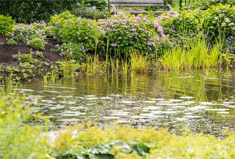 Diese besonderen Eigenschaften sind es, die Wasserpflanzen im Gartenteich so wichtigmachen. Denn sie sind ein fester Bestandteil im kleinen Ökosystem und sorgen dafür, dass die Wasserqualität gut bleibt. Wie sie das machen? Einfach, indem sie wachsen und gedeihen. Einfacher geht es doch fast gar nicht mehr, oder? Wasserpflanzen sind sehr wüchsig und benötigen für ein gesundes und üppiges Wachstum viele Nährstoffe. Die holen sie sich aus dem Wasser. Und was erst einmal schlecht für andere Bewohner klingt, hilft, den Teich gesund zu halten. Denn durch den hohen Nährstoffbedarf der Wasserpflanzen haben Algen keine Chance. Die benötigen nämlich ebenfalls Nährstoffe, um zu wachsen und weil niemand Algen im Teich haben will, sind Teichpflanzen die perfekten natürlichen Feinde für Algen. Und ganz ehrlich: Sie sehen auch viel besser aus, oder? Dabei funktioniert das Prinzip „viel hilft viel“ aber nicht unbedingt. Denn je mehr Pflanzen im Teich wachsen, desto mehr Nährstoffe werden benötigt. Einige Pflanzen werden dann den Kürzeren ziehen müssen und über kurz oder lang absterben. Abgestorbene Pflanzenteile fangen an zu faulen und die Wasserqualität leidet. Also gilt gerade bei der Neuanlage: weniger ist mehr! Schließlich kann man bei Bedarf immer noch nachpflanzen.