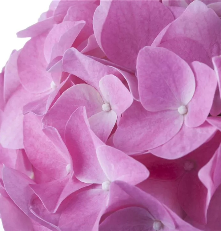 Die rosafarbenen, schalenförmigen Blüten der Bauernhortensie erscheinen in Dolden von Juni bis September.