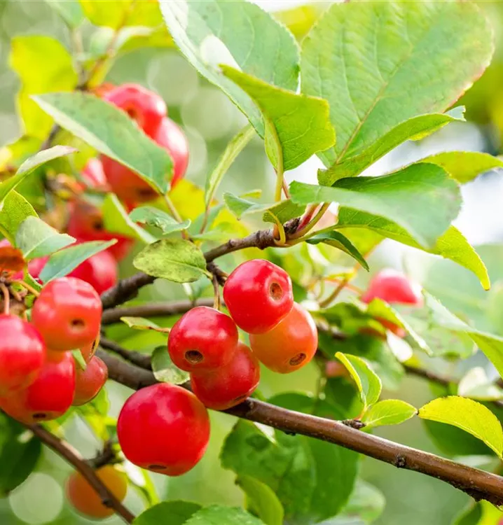 Besonders dekorativ sind die orange-roten, runden Früchte von Malus 'Evereste'®. Diese erscheinen ab August und sind klein.
