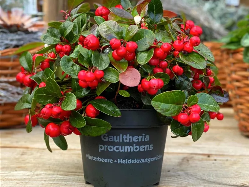 Die Winterbeere ist eine winterharte und immergrüne sehr dekorative und leicht bodendeckende Gartenpflanze die ab September leuchtend rote Beeren entwickelt. Sie wird gerne für adventliche und weihnachtliche Bepflanzungen und Dekorationen genutzt.