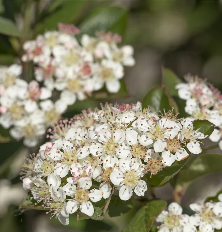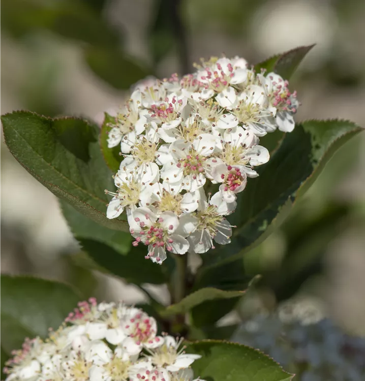 Aronia melanocarpa bildet in Rispen angeordnete, weiße Blüten ab Mai.