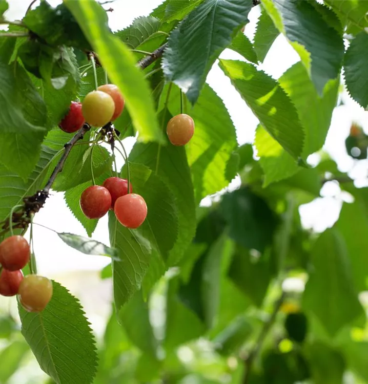 Die roten Früchte haben einen süß-säuerlichen Geschmack. Reifezeit ab Juli.