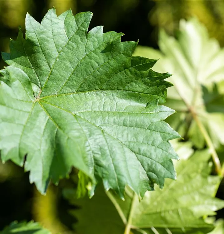 Die sommergrünen Blätter der Weintraube sind dunkelgrün, herzförmig, gezähnt. Weintraube zeigt sich leuchtend kupfergelb bis rot im Herbst.