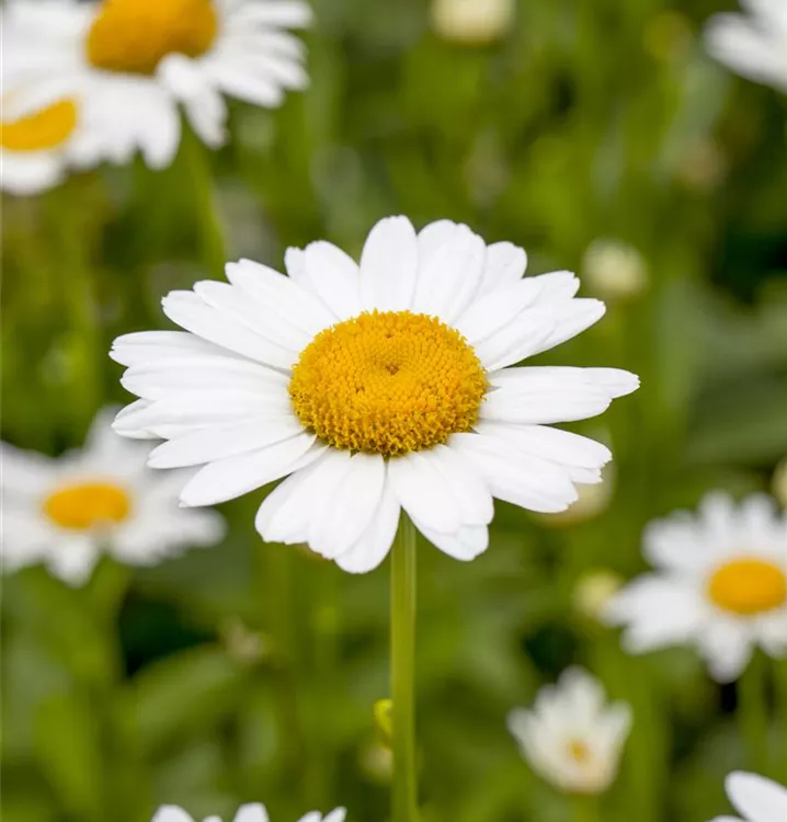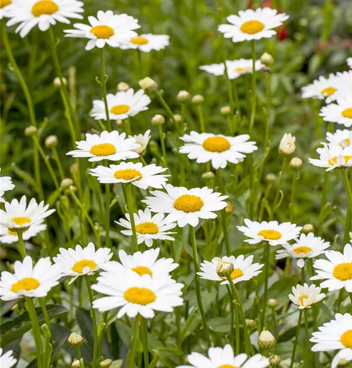 Die Großblumige Garten-Margerite (Leucanthemum x superbum) ist eine aufrechte Staude, die von Juli bis August weiße Blüten mit einem angenehmen Duft bildet. An einem sonnigen Standort mit durchlässigem, nährstoffreichem Boden erreicht sie gewöhnlich eine Höhe von ca. 1 m und wird ca. 50 cm breit. Die Großblumige Garten-Margerite ist gut frostverträglich.