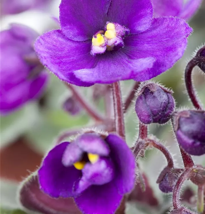 Das Echte Usambaraveilchen (Saintpaulia ionantha) blüht über Monate hinweg. Je nach Sorte, erscheinen die dekorativen Blüten in den Farben Weiß, Rosa, Rot und Lila. Bevorzugt wird ein sonniger Standort und eine durchlässige Erde.