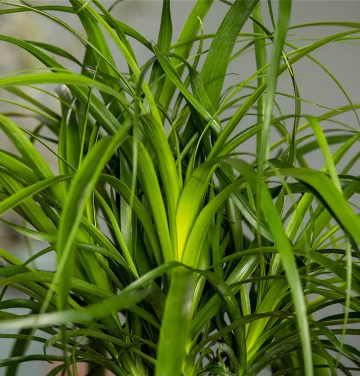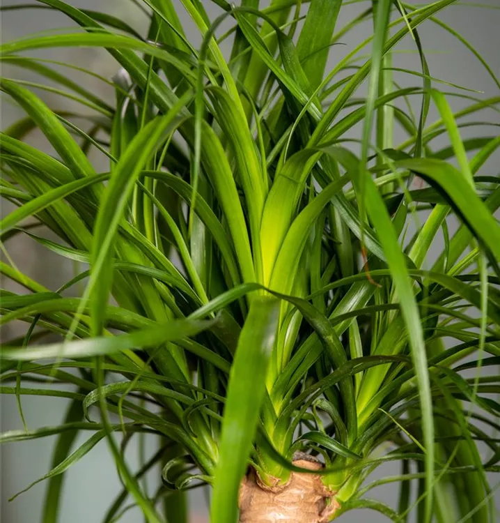 Der Elefantenfuß (Beaucarnea recurvata) trägt mittelgrüne, lineale, ganzrandige Blätter. Diese sukkulente Pflanze gedeiht am besten an einem sonnigen Standort.
